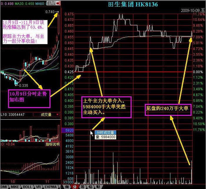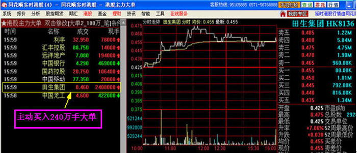 (2009年10月9日盤中截圖如下),我們?cè)诒P中監(jiān)控到田生集團(tuán)有大單2408000手主動(dòng)買入,成交價(jià)格是0.46港元。