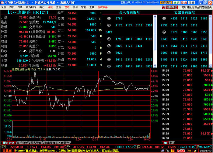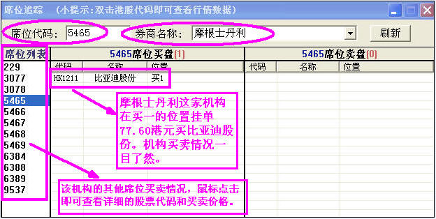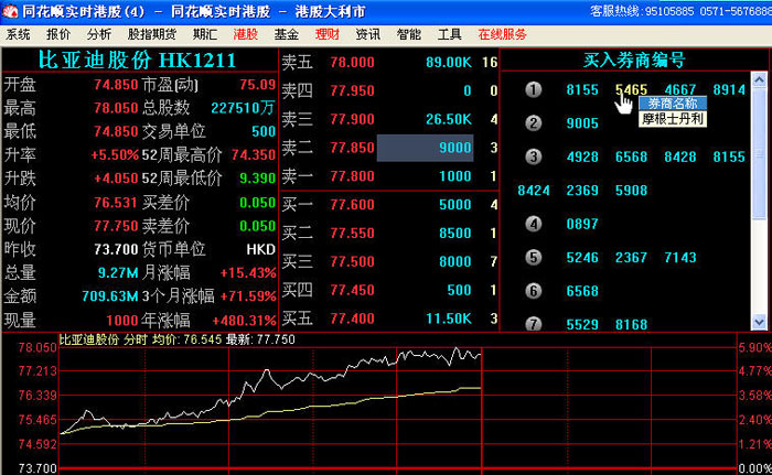 例如:比亞迪股份HK1211買入券商編號(hào)5465,鼠標(biāo)放上去顯示出券商名稱是“摩根士丹利”,如下: