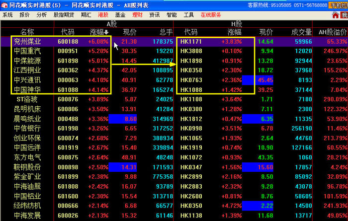 客服熱線:952555 3、A-H股列表對(duì)比